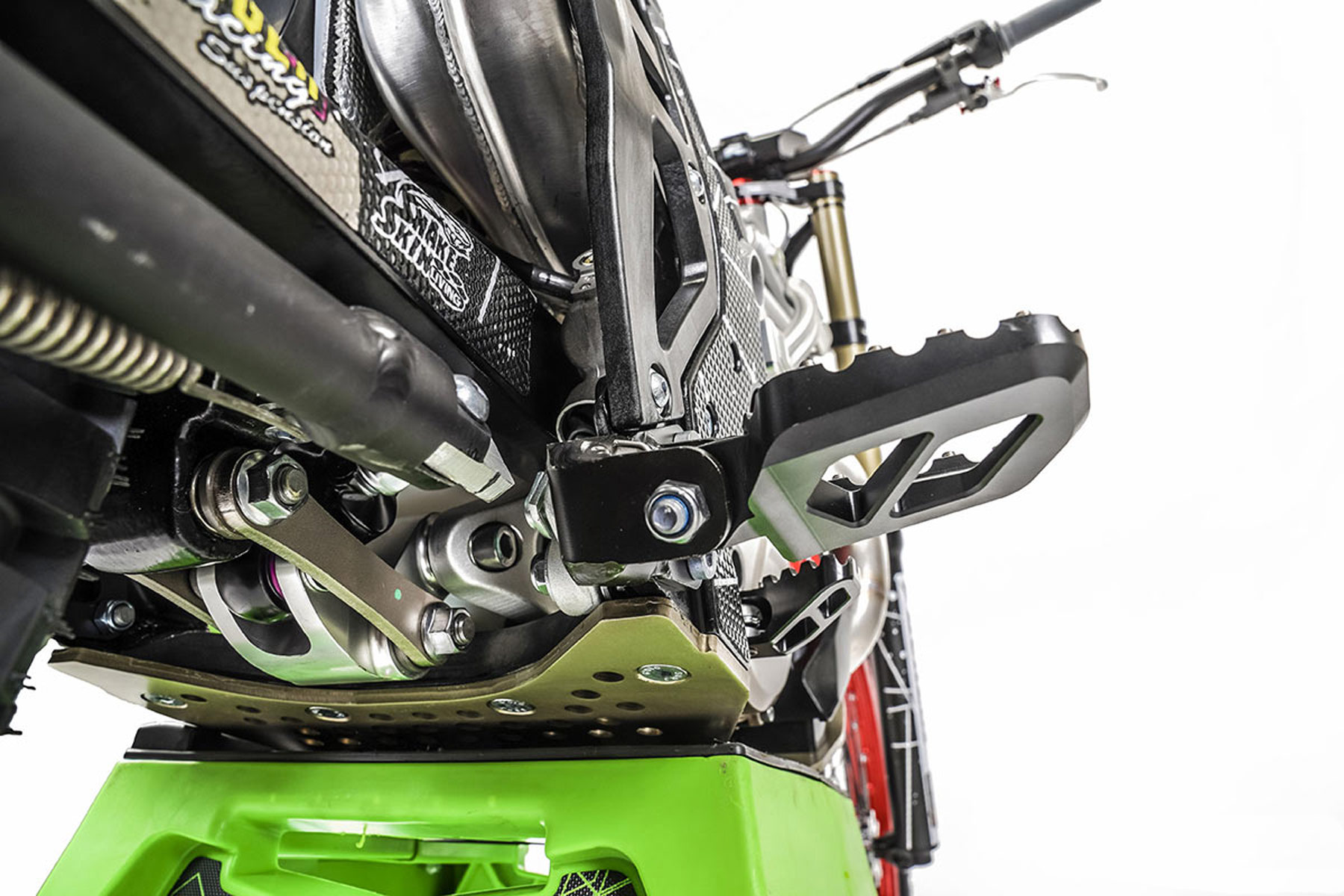 Schließlich verfügt das Chassis auch über gefräste Bremssättel aus Aluminium sowie Fußrasten und einen 6-mm-Unterfahrschutz. Die Felgen sind rot eloxiert und die Naben ebenfalls in Silber gefräst.
